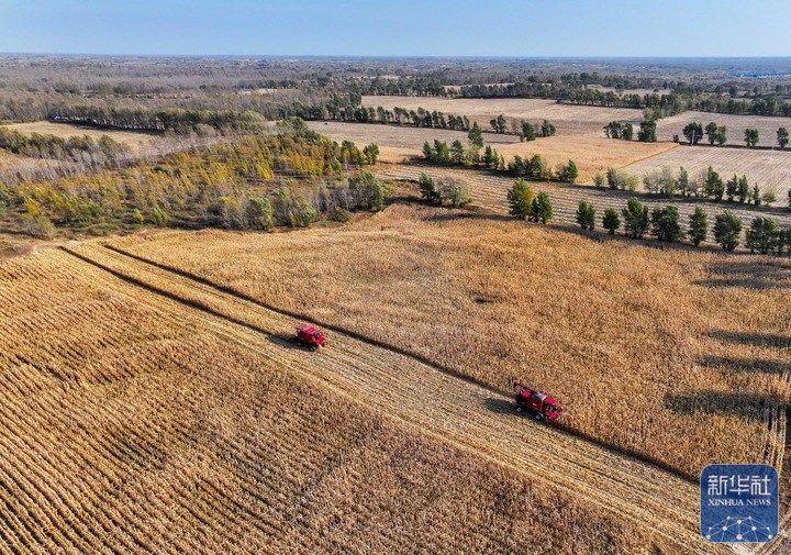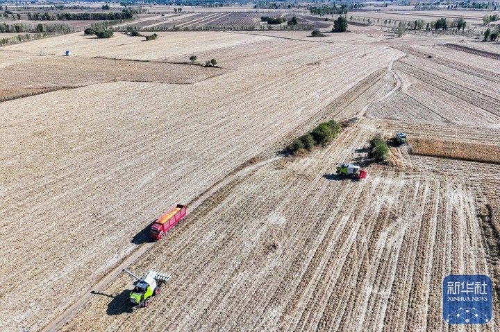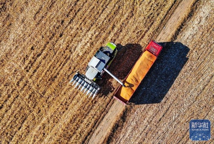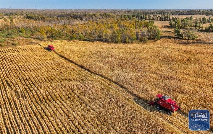 10月16日,在通辽市科尔沁左翼后旗巴胡塔苏木,农机手驾驶收割机在田间收获玉米(无人机照片)。