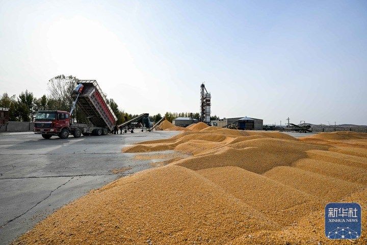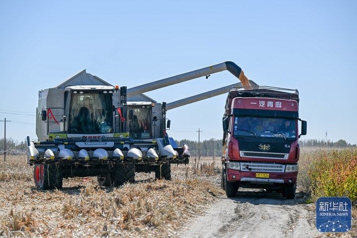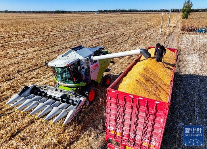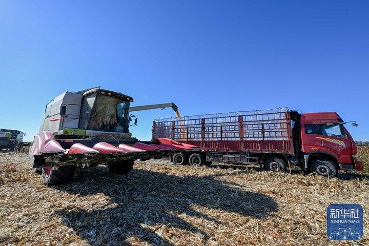10月19日,在通辽市开鲁县小街基镇明升村,农机手驾驶收割机把玉米装进卡车。