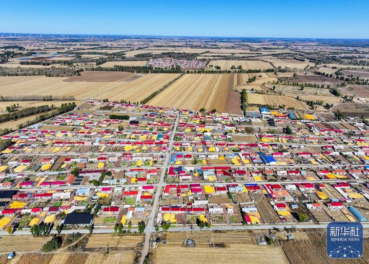 10月19日,在通辽市开鲁县小街基镇联盟村,村民的院落里处处晾晒着玉米(无人机照片)。
