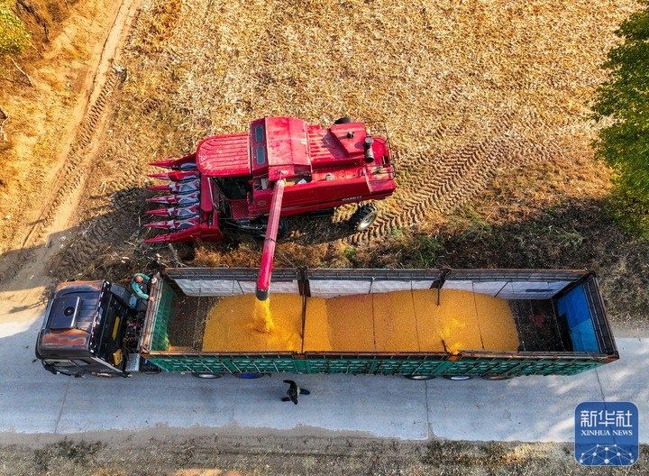 10月16日,在通辽市科尔沁左翼后旗巴胡塔苏木,农机手驾驶收割机将玉米装进卡车(无人机照片)。