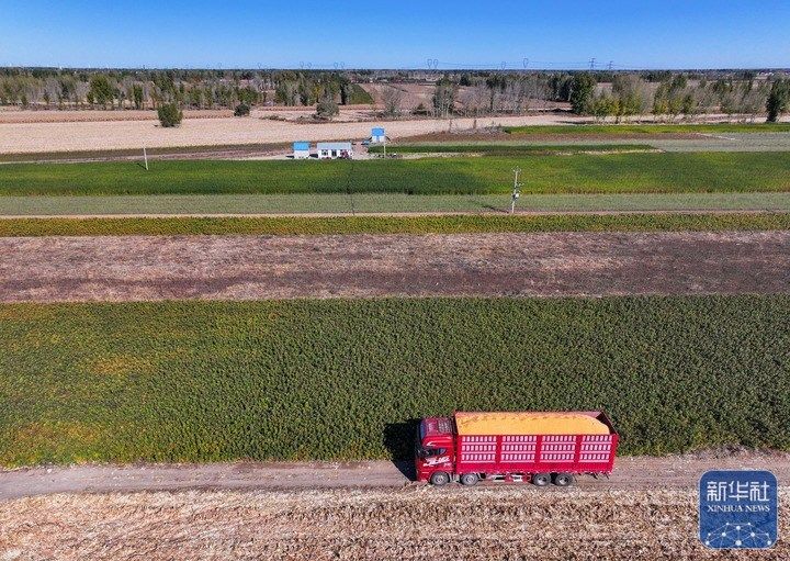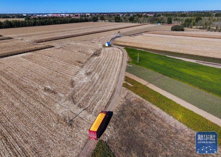 10月19日,在通辽市开鲁县小街基镇明升村,运粮车行驶在田地间(无人机照片)。