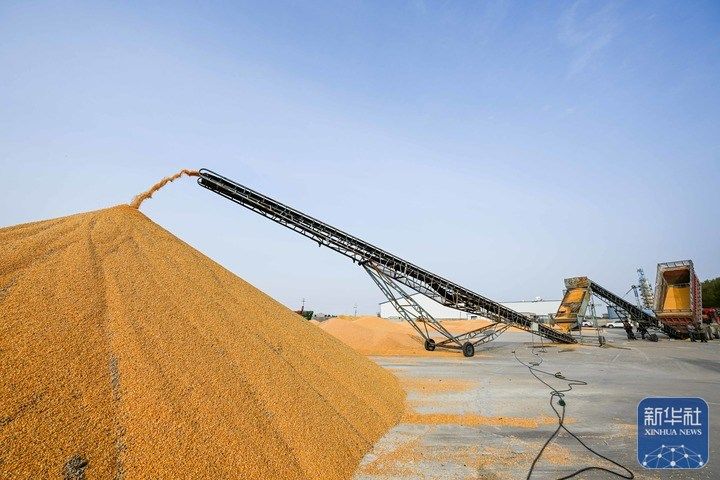 10月17日,在通辽市扎鲁特旗黄花山镇一家收粮站,工人操作传送带将收储的玉米送进烘干塔。