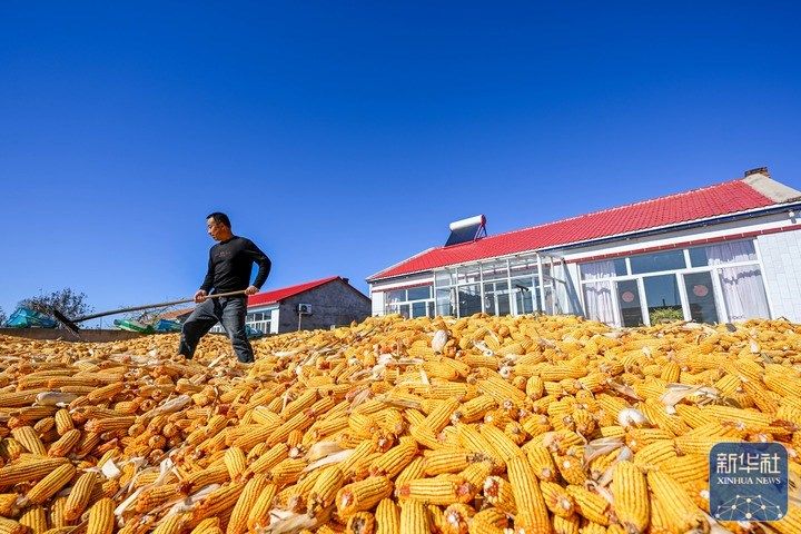 10月19日,在通辽市开鲁县小街基镇明升村,村民任国柱晾晒玉米。